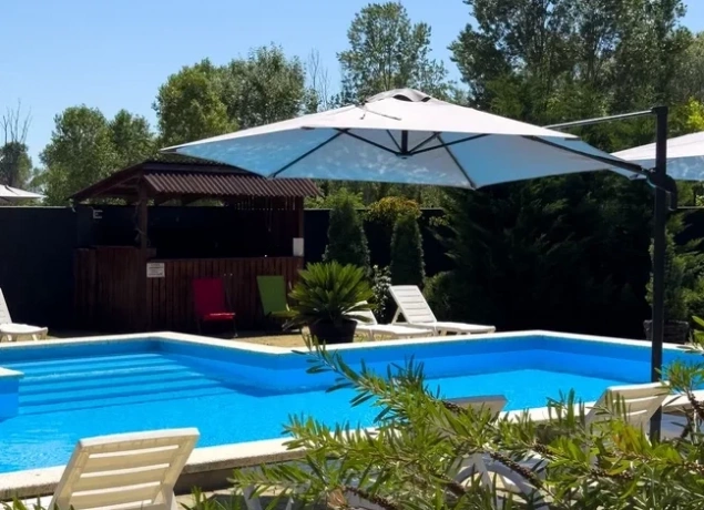 Оборудованная зона отдыха у бассейна с лежаками и зонтами.